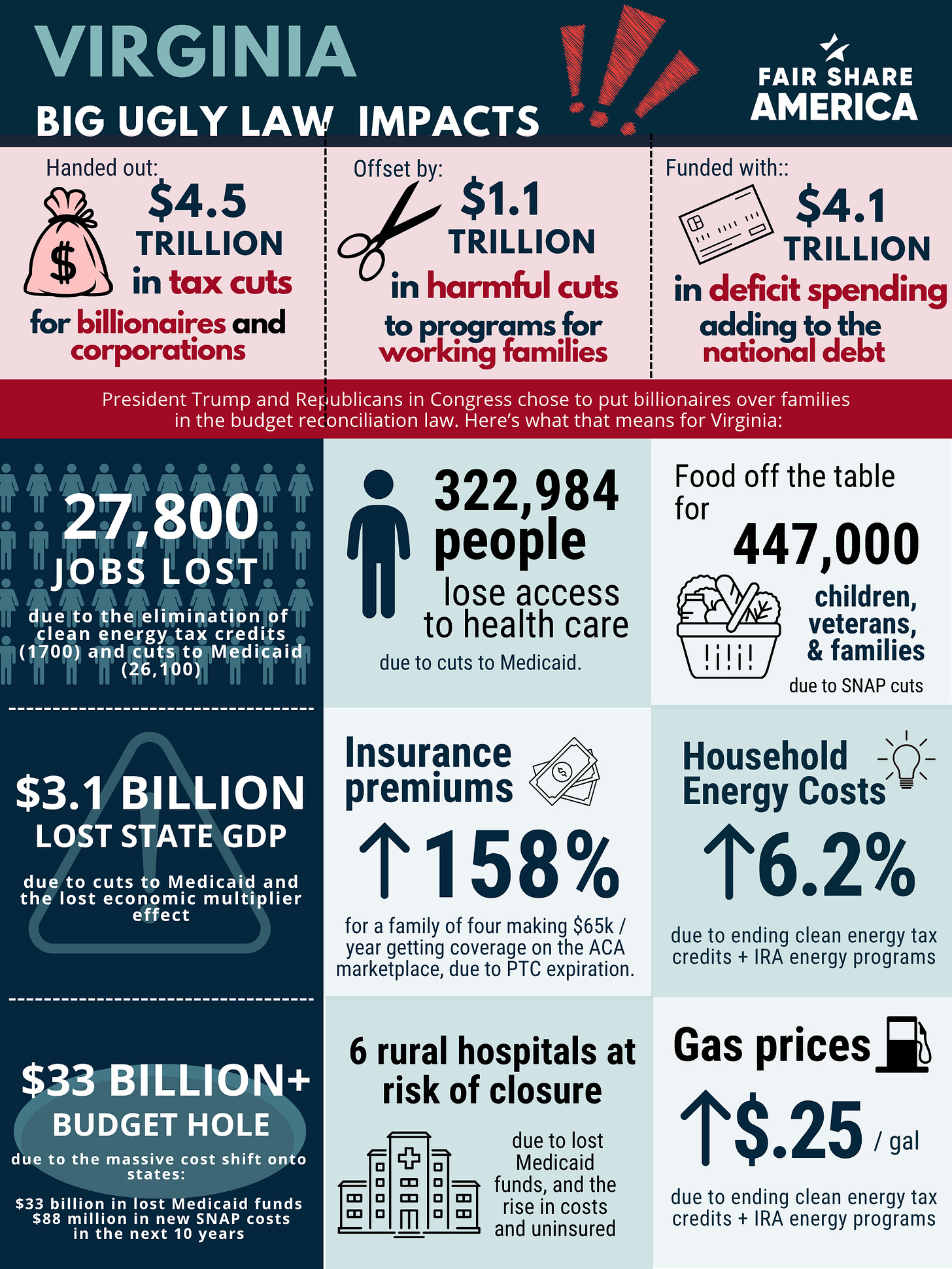 Fair Share America has released new state-specific impact graphics about Trump’s Big Brutal Bill for every state in the country. You can download them here to show your followers how many jobs in your state will be killed by Trump’s new bill, as well as how many people will lose healthcare, how much gas prices will go up, and more. Here’s a sample graphic for VA.